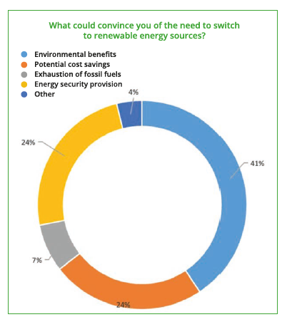 Environmental benefits were the main motivating factor for 41% of respondents, followed by economic considerations and energy security (24% each). Only 7% were concerned about the depletion of mineral resources, demonstrating persistent dependence on fossil fuels, which is also noted by many academic sources.