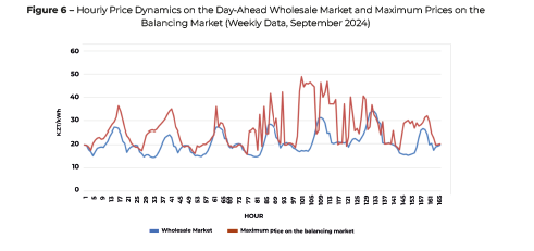 According to KOREM JSC, in September 2024, the minimum and maximum imbalance prices on the balancing market ranged from 0.01 to 63.21 KZT/kWh. Meanwhile, on the day-ahead wholesale market, data from SFC LLP indicates that electricity prices varied between 12.62 and 35.6 KZT/kWh depending on the hour. At the same time, the wholesale market exhibits relatively clear price trends with lower uncertainty, whereas the balancing market is characterized by high volatility and significant uncertainty.