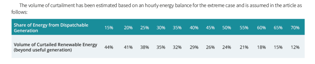 As noted above, the lowest cost from new generation can be achieved by leveraging the low cost of renewables. To do this, an excess amount of cheap renewable capacity must be built with the understanding that part of this energy will be curtailed when not needed. When calculating system costs, the cost of curtailed energy must also be taken into account.