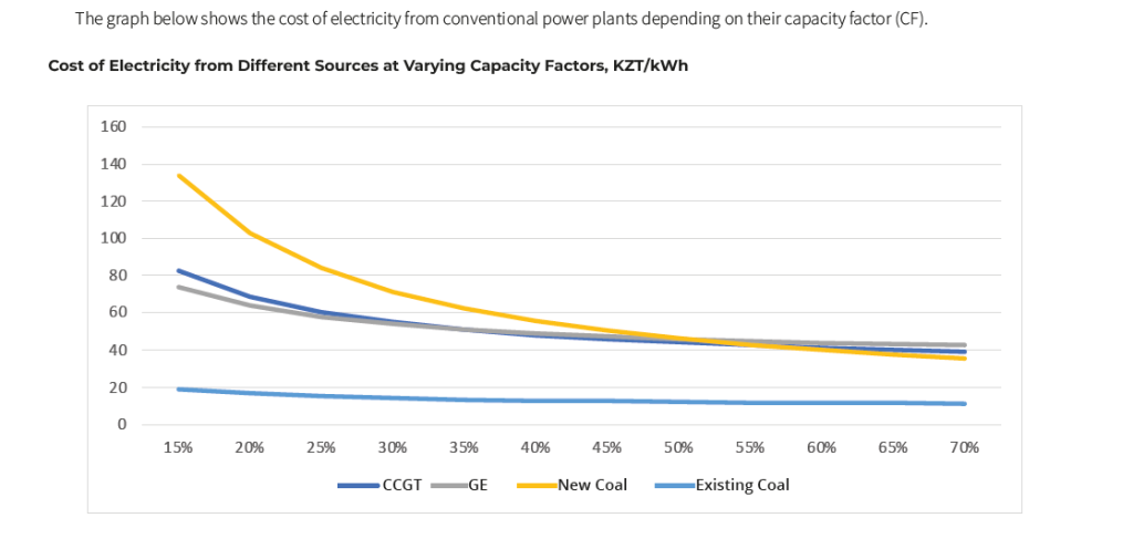 Existing power plants provide the lowest electricity cost. At low capacity factors, new gas-fired plants are cheaper than new coal-fired ones. However, when operating at a capacity factor above 50%, coal plants may offer lower costs due to cheaper fuel. The most competitive tariff from new plants can be achieved with high utilization and comprises around 40 KZT per kilowatt-hour.