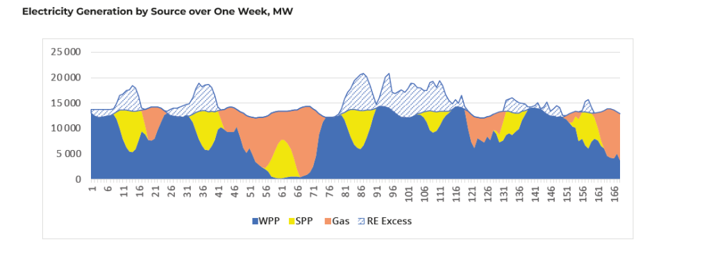 Key parameters of the modeled power system: Peak load of 16 GW, 10 GW of solar power plants, 24 GW of wind power, and 16 GW of gas-fired plants with 45% efficiency. The wind generation profile is based on average values from five sites with an average capacity factor of 37%. The capacity factor for solar power is 20%. Modeling results: renewable energy curtailment amounts to 18% beyond useful generation and is fully compensated to the investor. Gas-fired generation covers 29% of demand, operating at a capacity factor of 23%. The estimated electricity price is 32 KZT/kWh, excluding CO2-related costs.