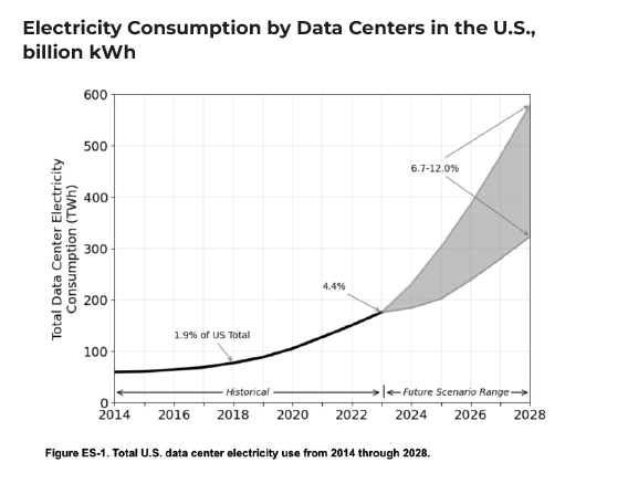 The United States offers a clear example of how the data center industry can affect electricity demand. Over the past five years, their share in national electricity consumption has increased from 1.9% to 4.4%. By 2028, this growth is expected to continue at least at the current pace.
