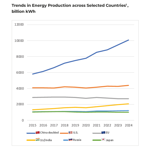 Average Annual Change in Electricity Generation Over 10 Years: China: +6.3%, USA: +0.8%, EU: -0.7%, India: +5.0%, Russia: +1.4%, Japan: -0.1%.