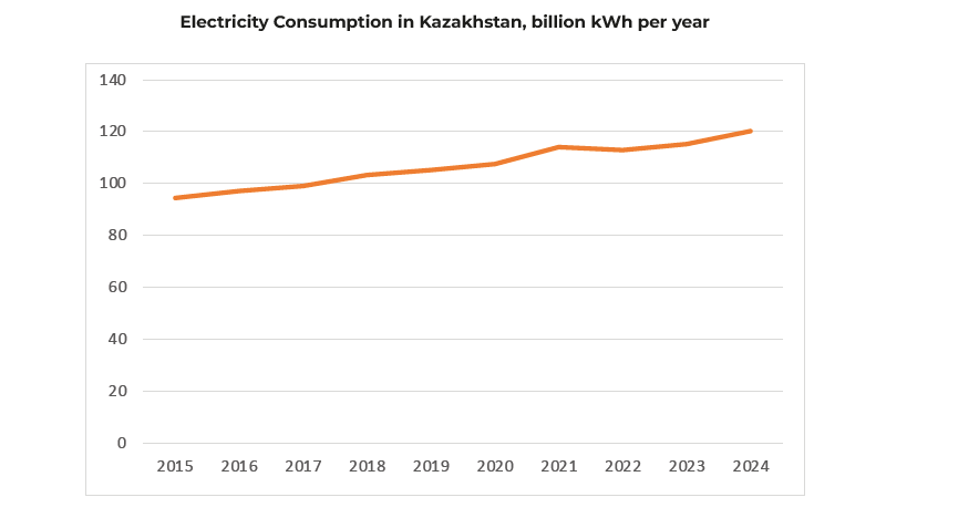 Compared to these countries, Kazakhstan occupies an intermediate position in terms of both the share of industry in GDP and the pace of economic growth. Over the past 10 years, electricity consumption in Kazakhstan has been growing at an average annual rate of 2.7%.