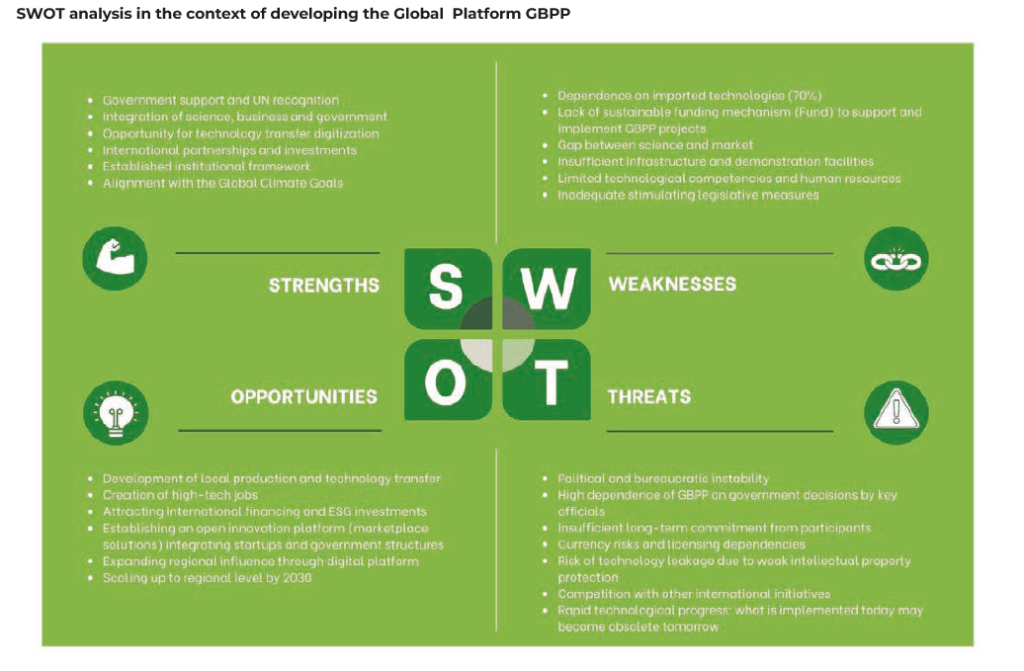 An analysis of strengths, weaknesses, opportunities and threats shows that Kazakhstan has significant potential for the development of the Green Bridge Partnership Programme (GBPP), despite the existing challenges. Strengthening the institutional base, digitising technology transfer and actively involving international partners create the basis for overcoming the limitations identified in the SWOT analysis.