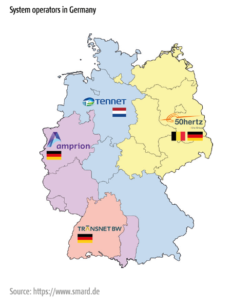 The German transmission system is divided into four regions, known as control zones. Each control area has a transmission system operator, or TSO, responsible for the safety and stability of the grid: Amprion GmbH, TransnetBW GmbH, TenneT TSO GmbH and 50Hertz Transmission GmbH.