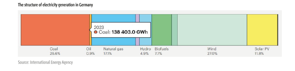 According to the International Energy Agency (IEA), electricity generation in Germany in 2023 amounted to 520 003 GWh, of which 27% was wind energy, 27% coal, 17.1% natural gas, 11.8% solar, 4.9% hydropower, 7.7% - biofuels. The output of renewable energy power plants exceeds the output of fossil fuel-based power plants.