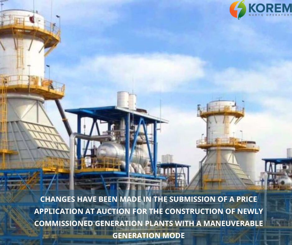JSC "KOREM" informs, that according to the protocol decision of the Meeting on the issue of changing the submission of a price application at auction for the construction of newly commissioned generation plants with maneuverable generation mode No. PR-193 dated 16.08.2024 of the Ministry of Energy of the Republic of Kazakhstan, changes have been made in the MGM trading system and in the internal regulatory documentation governing the organization and conduct of auctions for the construction of newly commissioned generation plants with a maneuverable generation mode, approved by the Order of the Chairman of the Board of JSC "KOREM" dated December 14, 2022 No. 160-OD, in part of paragraph 64 of paragraph 2 of Chapter 6 as follows: