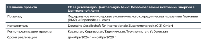 Для решения экологических и социально-экономических задач и внесения вклада в устойчивое будущее Казахстана и Центральной Азии посредством продвижения интеграции возобновляемых источников энергии Германское общество по международному сотрудничеству (Deutsche Gesellschaft für Internationale Zusammenarbeit (GIZ) GmbH) реализует региональный проект «ЕС за устойчивую Центральную Азию: возобновляемые источники энергии в Центральной Азии» (EURECA).