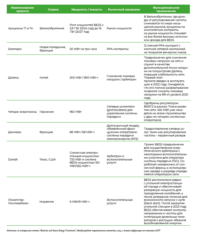 Ниже представлены различные примеры использования BESS в энергосистемах.