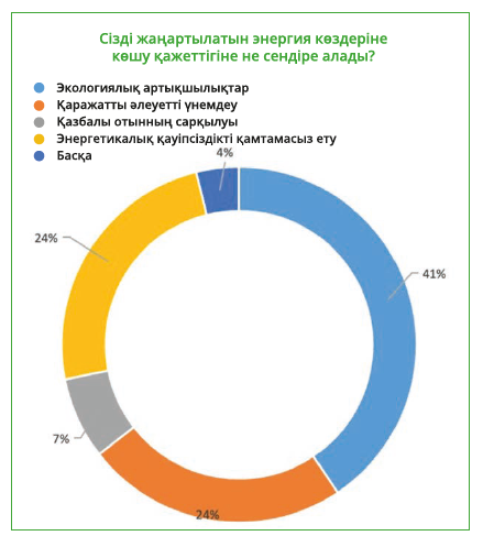 «Жасыл көздерге» көшуге ең көп ынталандыратын фактор ретінде сауалнамаға қатысқандардың 41%-ы экологиялық артықшылықтарды атады, ал экономикалық себептер мен энергетикалық қауіпсіздікті қамтамасыз ету қажеттілігі әрқайсысы 24%-ды құрады. Пайдалы қазбалардың сарқылуы респонденттерді аз алаңдатты (7%), бұл қазба отынына тәуелділіктің жоғары әсерін көрсетеді, мұны көптеген академиялық көздер де атап өтеді.