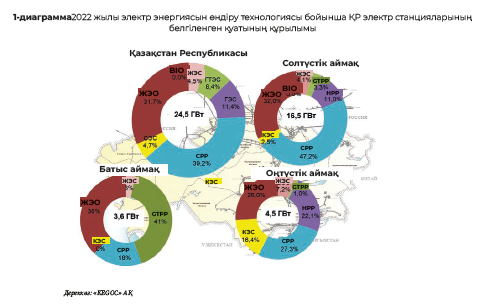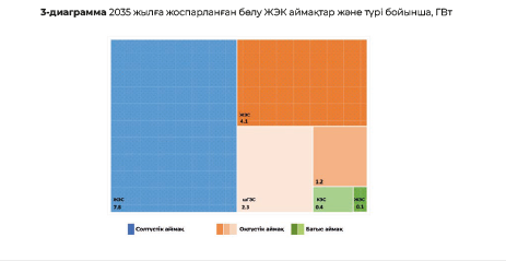 2035 жылға арналған ЖЭК объектілерін іске қосудың болжамды көлемдерін талдау Қазақстанның энергия жүйесінің Солтүстік (49%) және Оңтүстік (48%) аймақтарында ЖЭК белгіленген қуатының негізгі өсімі күтілетінін көрсетті. Бұл ретте Солтүстік аймақта ЖЭК дамыту тек ЖЭС есебінен жоспарланады, ал Оңтүстік аймақта ЖЭС, КЭС және шГЭС қуаттарын енгізу болжанады.