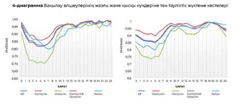Оңтүстік аймақ коммуналдық-тұрмыстық тұтынудың едәуір үлесіне байланысты ең аз біркелкі және тығыз жүктеме кестесіне ие. Қарастырылған тәуліктік жүктеме кестелерінің барлығында күндізгі (10+12 сағат) және түнгі (19+23 сағат) жүктеме шыңдары бар.