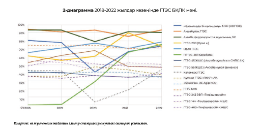ГТЭС белгіленген қуатты пайдалану коэффициентінің (БҚПК) есепті мәндерін талдау көрсеткендей, өз жүктемесін іс жүзінде бірнеше резервпен жабатын мұнай-газ секторының электр станцияларын қоспағанда, негізгі ГТЭС өзінің реттеу диапазонын толық көлемде іске асырмай, негізінен 74-90% БҚПК мәнімен базалық режимде жұмыс істеді.