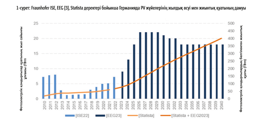 Алекс Болога, ЖЭК жөніндегі сарапшы, Global FactorФотоэлектрлік энергия (PV) – Германияның энергетикалық жүйесін түрлендіру және төмен көміртекті электр энергиясын өндіру мақсатына жету үшін қажетті негізгі технологиялардың бірі. Германия Қытаймен, Америка Құрама Штаттарымен, Жапониямен және Үндістанмен бірге PV жүйелерінің белгіленген қуаты бойынша бес елдің қатарына кіреді. Фраунгофер күн энергиясы жүйелері институтының (ISE) мәліметтері бойынша, Германияда 2020 жылдың соңына қарай шамамен 67 ГВт жиынтық PV қуаты орнатылды. 2023 жылы Германияның ЖЭК туралы заңының жаңартылуымен PV жүйелерін кеңейту мақсаттары 2030 жылы 215 ГВт-қа және 2040 жылы 400 ГВт-қа дейін едәуір өсті (1-сурет).