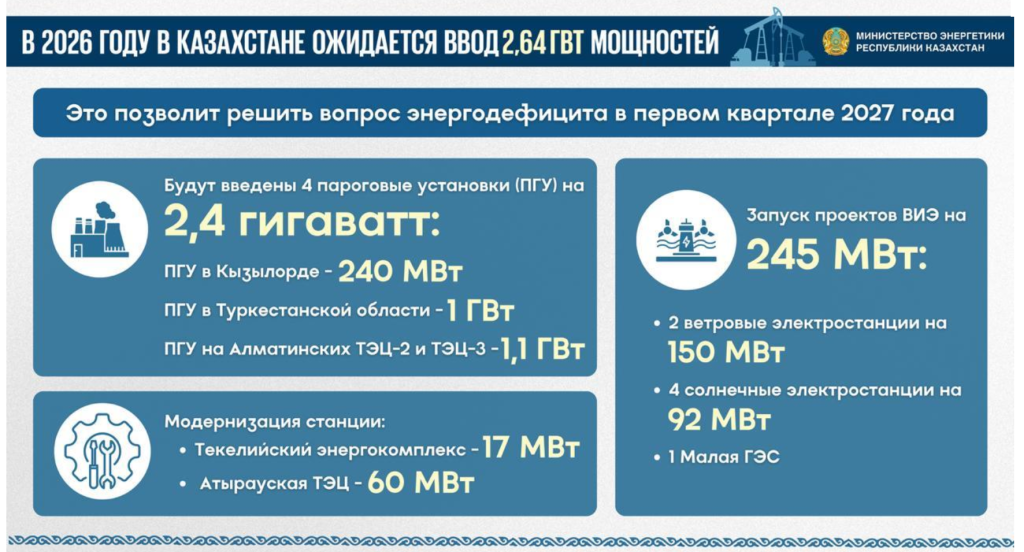 Глава государства на расширенном заседании правительства напомнил, что в прошлом году Казахстан импортировал 3,7 млрд кВт·ч электроэнергии, и поручил ускорить ввод новых мощностей. Все вводимые в 2026 году энергообъекты в совокупности будут производить около 16 млрд кВт·ч в год.