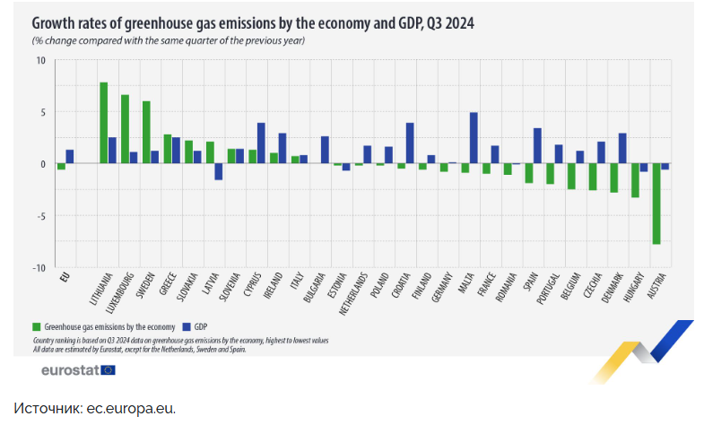 По оценкам Евростата, таких стран было 6 – это Литва, Люксембург, Швеция, Греция, Словакия, Латвия. Их выбросы выросли более чем на 2% по сравнению с третьим кварталом 2023 года, тогда как в остальных 5 странах ЕС выбросы выросли менее чем на 2% или остались на том же уровне (Болгария). Выбросы в Латвии, по оценкам, выросли даже несмотря на сокращение экономики.