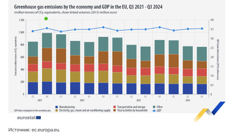 QAZAQ GREEN. В третьем квартале 2024 года выбросы парниковых газов в экономике ЕС составили 767 млн тонн CO2-эквивалента по сравнению с 772 млн тонн СО2-эквивалента за аналогичный квартал 2023 года. Такие данные квартальной оценки Q3 2024 выбросов парниковых газов по видам экономической деятельности приводит Eurostat, сообщает Ecopolitic.